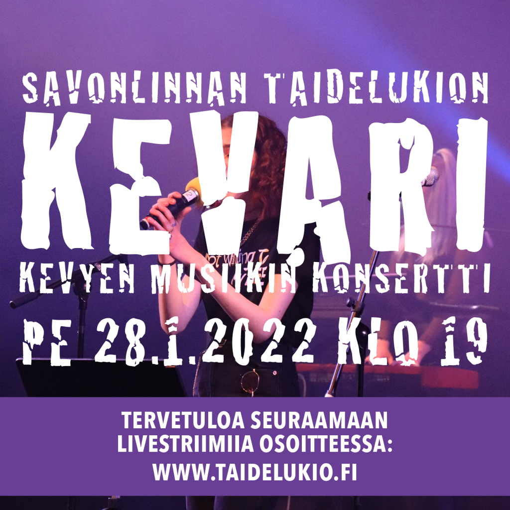 Savonlinnan taidelukion kevyen musiikin konsertti, kevari klo 19 alkaen Savonlinnasalissa.Konserttiin ei oteta yleisöä. Konsertti live-striimataan ja striimi on katsottavissa osoittessa www.taidelukio.fi
